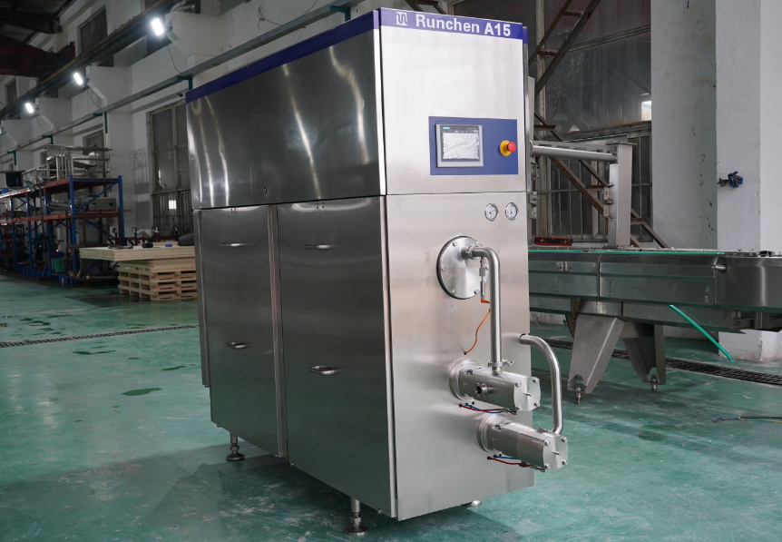 潤辰緊跟不斷擴大的市場需要的腳步,最新推出Runchen ©Frunt ?-A1500型全自動冰淇淋凝凍機,該機型每小時最高可生產1500L冰淇淋,滿足廠商的各種生產需求。