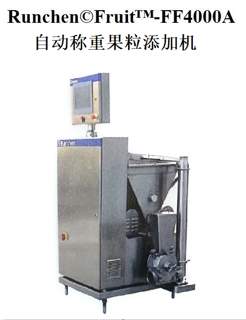 Runchen©FruitTM-FF4000A是一臺帶自動稱重系統(tǒng)的果粒添加機,完全滿足食品衛(wèi)生的需要。該設(shè)備由高品質(zhì)和高質(zhì)量的零部件組成,其設(shè)計達到嚴格的衛(wèi)生、可靠及耐用的標準。所有和冰淇淋漿料接觸的零部件均由304不銹鋼加工。該機裝有腳輪,便于移動與安置。